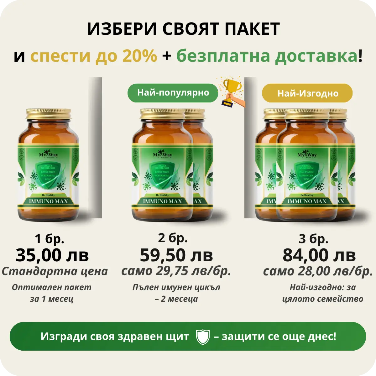 IMMUNO MAX предоставя широк спектър от ползи на цена, която го отличава от други премиум продукти. Освен това, всяка опаковка съдържа пълноценни дневни дози за един месец, което го прави достъпен и ефективен избор.