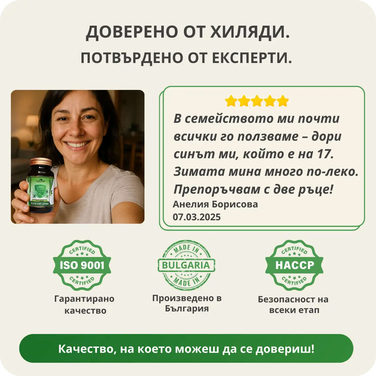 Зимата всяка година съм на антибиотици по два пъти. С тази добавка минах ноември и декември без нито една настинка. Не вярвах, че ще има такъв ефект.