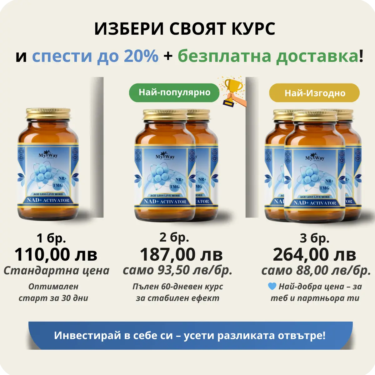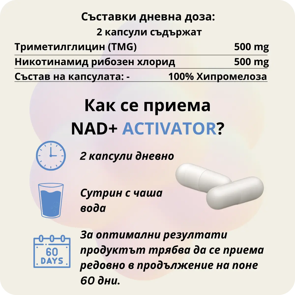 Всяка капсула NAD+ ACTIVATOR съдържа оптимална доза от NR и TMG, за да ви предостави пълноценна подкрепа. Една опаковка осигурява достатъчно за цял месец, като гарантира видими резултати в кратък срок.