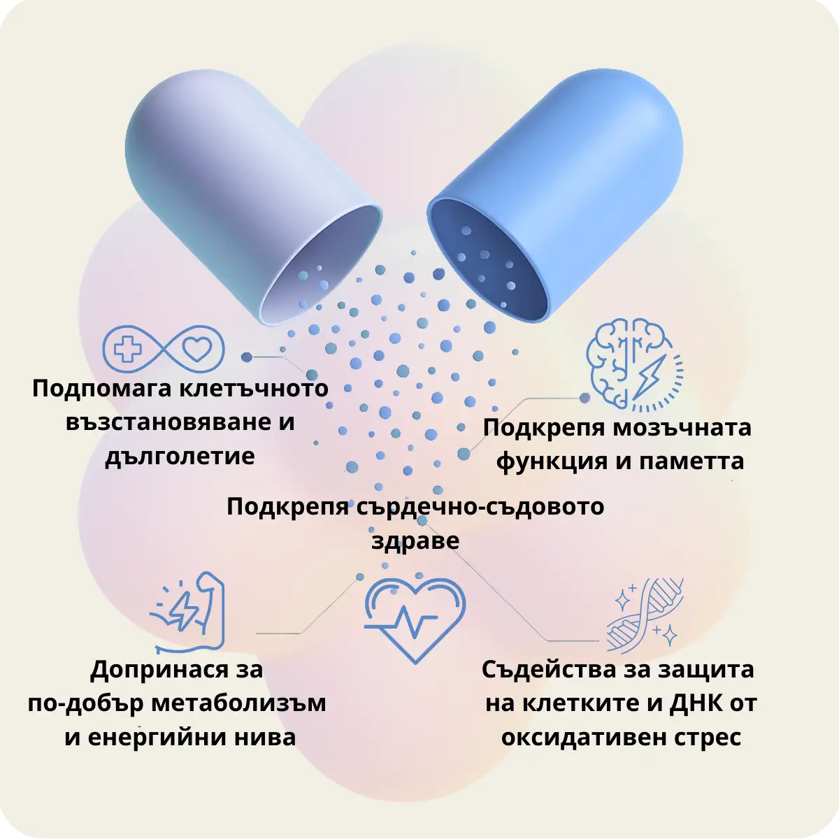 NAD+ е молекулата, от която зависи вашето тяло. С увеличаване на нивата на NAD+, продуктът стимулира митохондриите – енергийните централи на клетките ви. Това води до значително подобряване на клетъчната енергия, физическата издръжливост и когнитивните функции.
